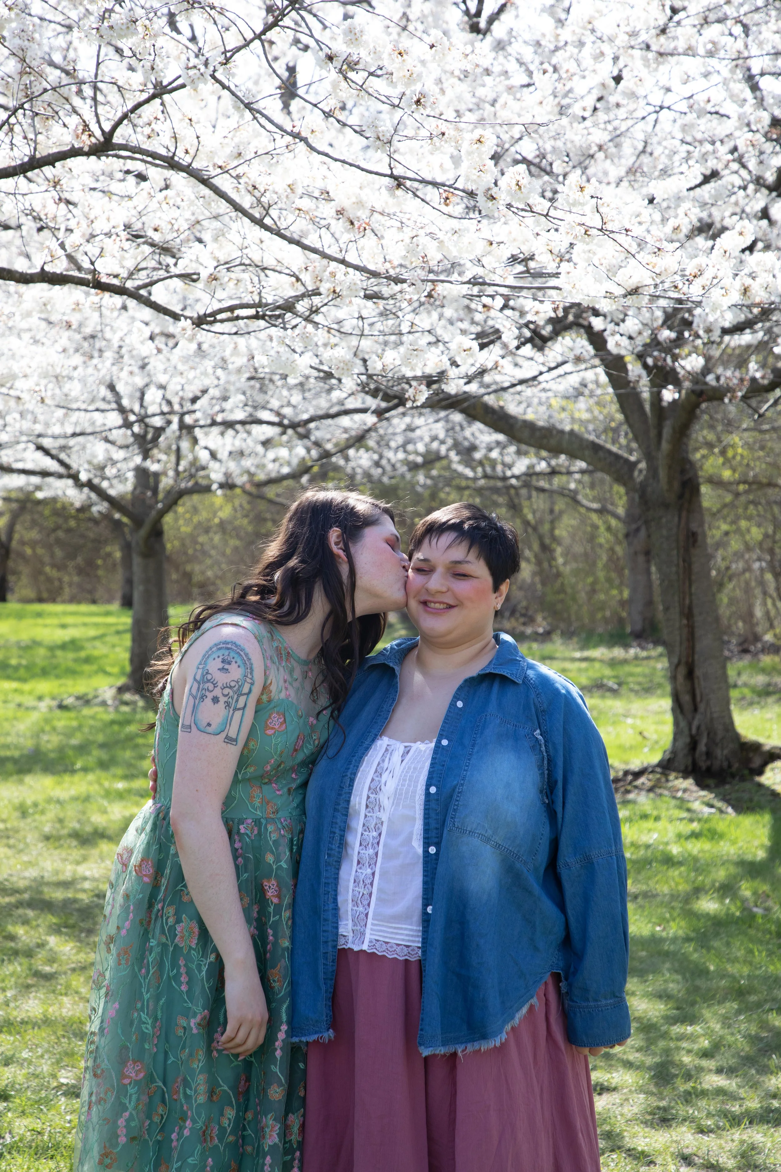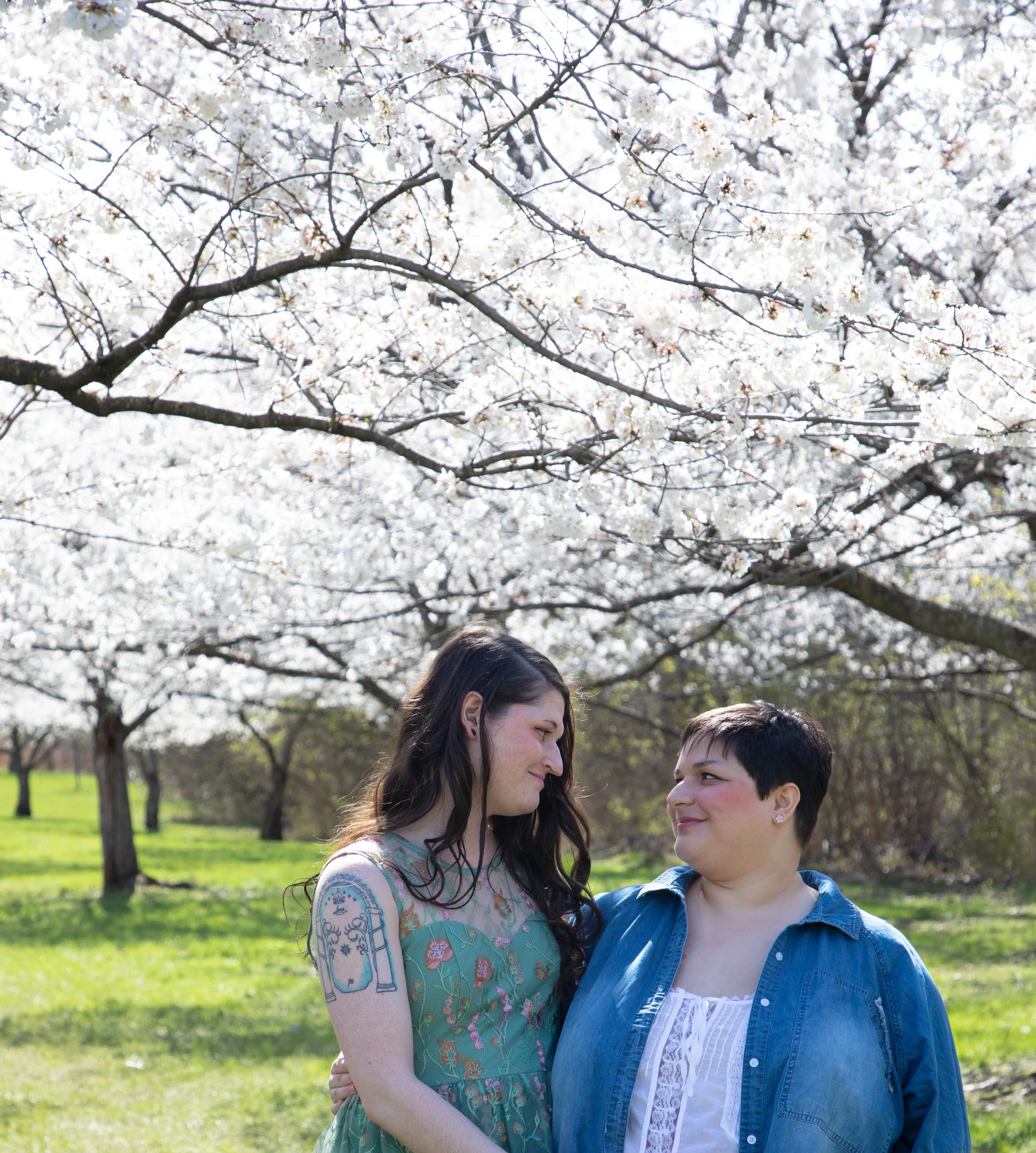 Lily & Olivia’s engagement photography session took place on a sunny day in April 2025. Sarah Jae captured this beautiful couple’s session on digital and film photography. Lily & Olivia had a soft spring palette for their wedding colors and chose to travel to us during peak flower season. Brookside Reservation is home to some of the most stunning cherry blossom trees in Cleveland, Ohio. The couple dressed in colors complimentary to the scenery and we posed them affectionately among the blooms.